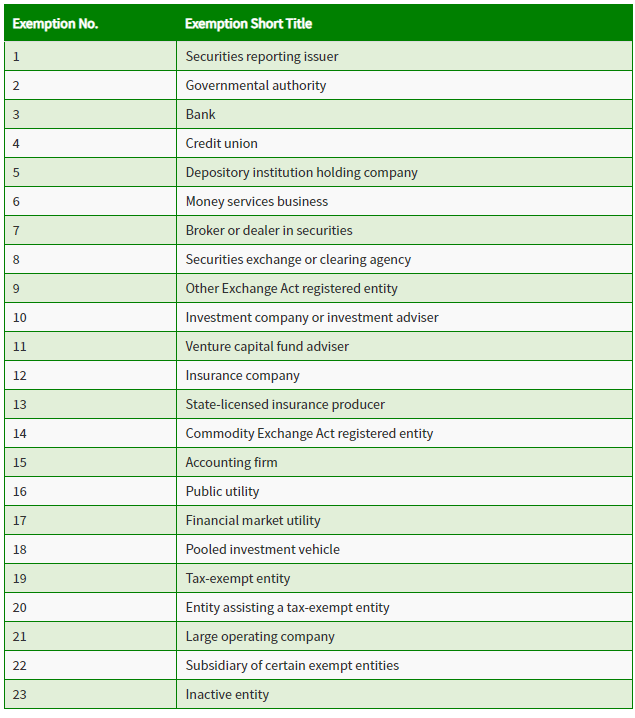 - 大型运营公司:任何实体:(A)在美国雇用超过20名全职员工,“美国全职员工”具有26 CFR 54.4980H-1(a)和54.4980H-3中规定的含义,但CFR这些章节中使用的“美国”一词具有31 CFR 1010.100(hhh)中规定的含义,(B)在美国境内设有实体办事处,并且(C)在美国提交了上一年的联邦所得税或信息申报表,证明总收入或销售额超过5,000,000美元,并在实体的IRS表格1120,合并的IRS表格1120,IRS表格1120-S,IRS表格1065或其他适用的IRS表格中报告为总收入或销售额(扣除退货和折让)形式,不包括根据联邦所得税原则确定的来自美国境外来源的总收入或销售额。对于属于 26 USC 1504 所定义的关联公司集团并已提交合并申报表的实体,适用金额应为该集团合并申报表上报告的金额。